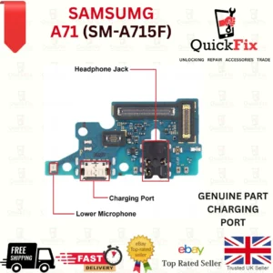 Replacement charging port connector with microphone and audio jack PCB board for Samsung Galaxy A71 SM-A715F / DS. Restores charging, audio, and mic functionality.