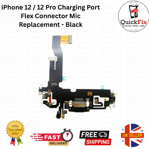 For iPhone 12 / 12 Pro Charging Port Flex Connector with Microphone – Black. OEM-quality replacement to restore charging, data transfer, and microphone functionality.