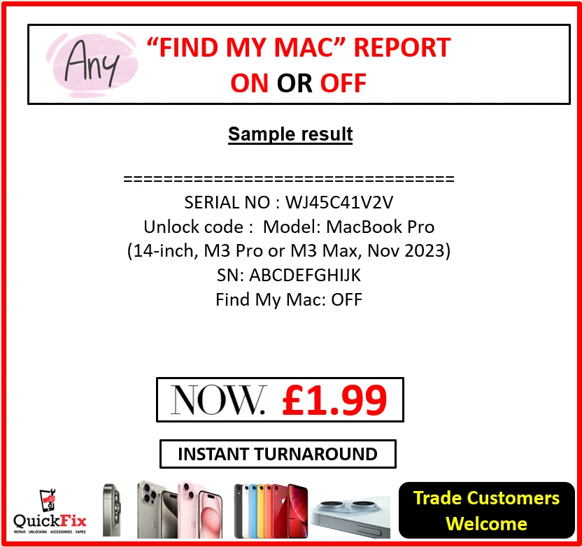 Ensure your Apple device is safe to use or sell with our MacBook / iMac Find My Mac (FMM) / FMI Activation Lock Checker. This service allows you to quickly verify whether Activation Lock / Find My Mac is ON or OFF using only the device’s serial number.